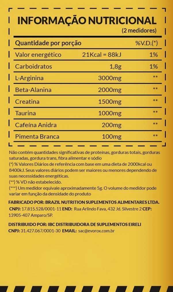 Possui doses super concentradas de Arginina, Creatina, taurina, L-Alanina e cafeína.
