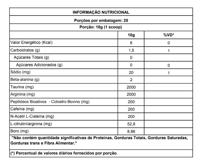 Beta-alanina, Taurina, Arginina, Colostro Bovino Integral (peptídeos bioativos), Alga Chondrus Crispus Invernal (L-citrulinilarginina), N-Acetil L-Cisteína, Cafeína, Tetraborato de sódio decahidratado (Boro), Isomaltulose (PalatinoseTM), Acidulante Ácido Cítrico, Antiumectante Dióxido de Silício e Estearato de Magnésio, Corante artificial amarelo crepúsculo, Aroma natural e idêntico ao natural, Edulcorante Sucralose e Espessante Goma Xantana.