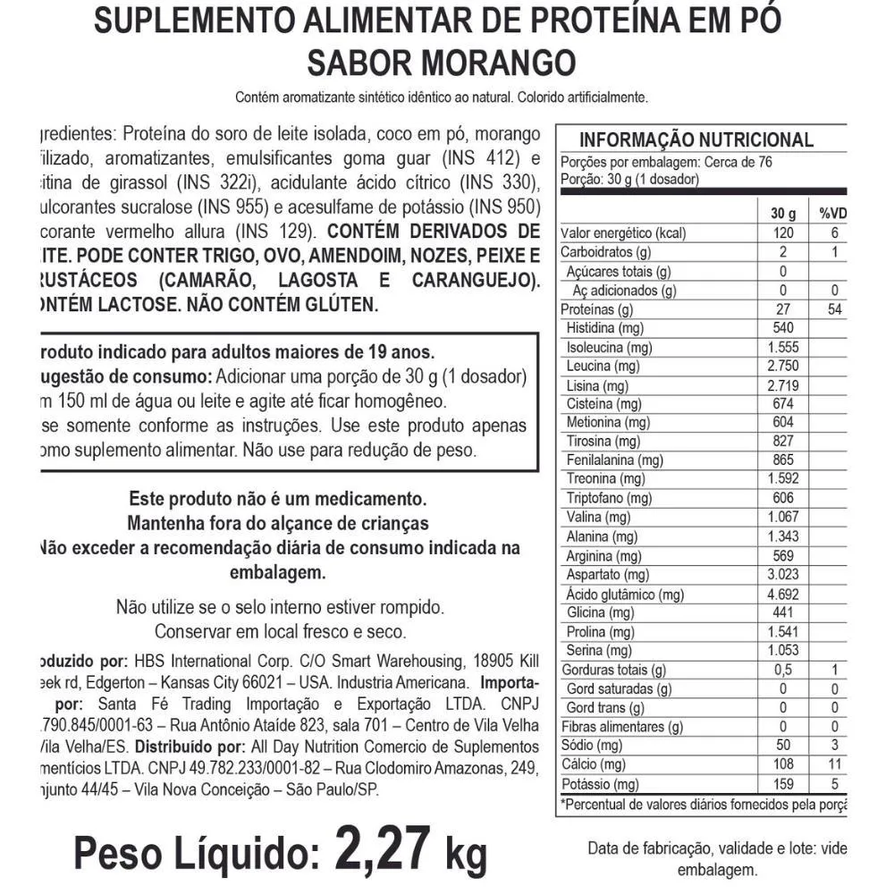 Proteína de soro de leite isolada, proteína de soro de leite isolada hidrolisada, acessulfame de potássio e sucralose. Sabor Chocolate: aroma natural de chocolate, aroma artificial de chocolate e cacau. Sabor Baunilha: aroma natural de baunilha. Sabor Frutas Tropicais: aroma natural de frutas tropicais, aroma artificial de frutas tropicais. Sabor Morango: corante natural vermelho beterraba, aroma natural de morango, aroma artificial de morango. Não Contém Glúten.