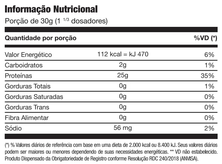BAUNILHA: Proteína Isolada do Soro do Leite, Aroma Id. ao Natural Baunilha, Aroma Id. ao Nat. de Baunilha Caramelada, Espessante Goma Xantana e Edulcorante Sucralose;