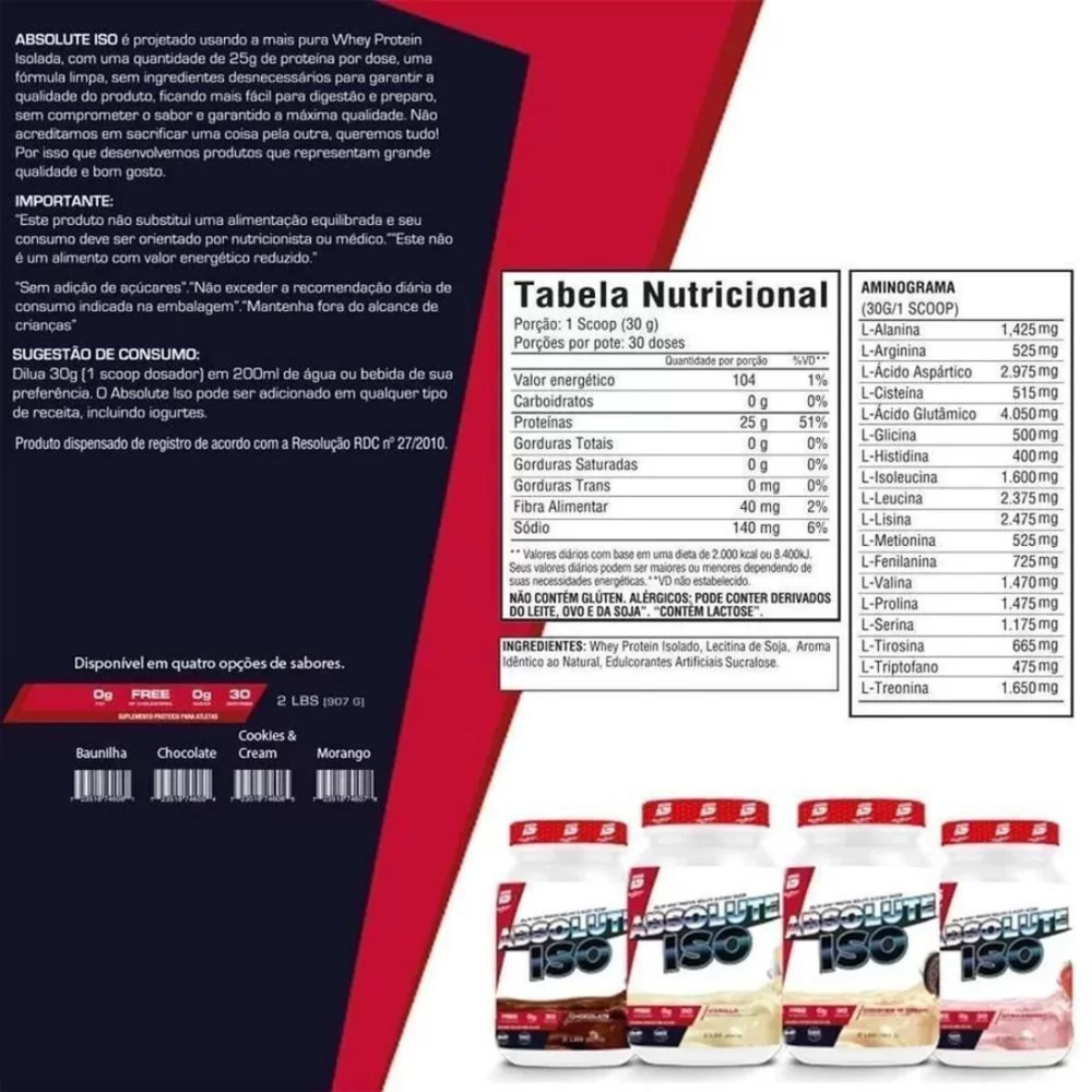 ABSOLUTE ISO é projetado usando a mais pura Whey Protein Isolada, com uma quantidade de 25g de proteína por dose, uma fórmula limpa, sem ingredientes desnecessários para garantir a qualidade do produto, ficando mais fácil para digestão e preparo, sem comprometer o sabor e garantindo a máxima qualidade.